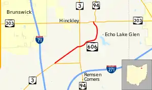 SR 606 commences at a T-intersection with SR 3 at the boundary of Hinckley and Granger Townships approximately 4.50 miles (7.24 km) northeast of Medina, and 1 mile (1.6 km) northeast of the SR 3 interchange off of Interstate 71, its exit 222. The highway immediately crosses into Hinckley Township as it departs to the northeast from the SR 3 intersection. Starting out, SR 606 is bounded by open fields on the southeast side and houses on the northwest side. The highway crosses Stony Hill Road, then passes amidst a stretch where both sides of the roadway feature a mix of residences and woods, with a little bit of open space mixed in. SR 606 bends east and intersects SR 3 again, this time joined by SR 94. SR 606 crosses the road, and then curves back to the northeast. The area the route travels through is now more heavily wooded than previously, but a number of homes continue to dot the landscape. It curves to the east-northeast, passes Kellogg Road, then turns back to the northeast as it passes by the Hinckley Reservation. After intersecting Bellus Road, SR 606 bends to the north, and then to the northwest, prior to arriving at its endpoint at a T-intersection with the SR 94/SR 303 concurrency about 3.25 miles (5.23 km) west of Richfield.[6]