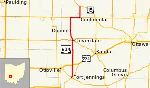 State Route 634 (SR 634) is a 17.95-mile-long (28.89 km) state highway in the northwestern portion of the U.S. state of Ohio. The highway runs from its southern terminus at its junction with SR 189 and SR 190 in Fort Jennings to its northern terminus at the intersection of SR 15 nearly 1.5 miles (2.4 km) north of Continental. SR 634 runs entirely within Putnam County and is entirely a two-lane highway.