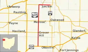 SR 637 begins at an intersection with U.S. Route 224 (US 224) in rural Van Wert County. The route heads north as a two-lane highway passing through farmland, with a few houses. The road enters Grover Hill, passing through residential properties and has an intersection with SR 114. The highway leaves Grover Hill and passes through farmland in rural Paulding County. The route has an at-grade crossing with Norfolk Southern Railroad tracks. After the tracks is an intersection with SR 613, in rural Jackson Township, Paulding County. North of SR 613, the highway passes through farmland, with some woodland. The route crosses the Flatrock Creek and begins a concurrency with SR 111. The concurrency heads east and enters the community of Junction. In Junction SR 111 turns northeast and SR 637 continues due east. The route crosses over the Auglaize River and passes through farmland. The northern terminus of SR 637 is at an intersection with SR 66, west of Arthur.[4][5][6][7]