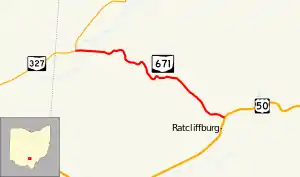 State Route 671 (SR 671) is an east–west state highway in the southern portion of Ohio. Existing entirely within Vinton County, the western terminus of this short connector route is at SR 327 three miles (4.8 km) northeast of the hamlet of Londonderry. Its eastern terminus is at U.S. Route 50 (US 50) in the unincorporated community of Ratcliffburg.