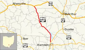 State Route 683 (SR 683) is a north–south state highway in the southern portion of the U.S. state of Ohio. The southern terminus of State Route 683 is at a T-intersection with State Route 93 about 0.50 miles (0.80 km) north of Hamden. Its northern terminus is also at a T-intersection, this time with U.S. Route 50 nearly 6 miles (9.7 km) west of McArthur.