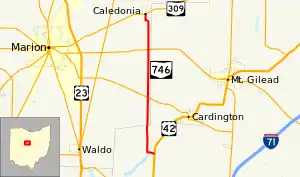State Route 746 (SR 746) is a northsouth thirteen-mile-long (21 km) state highway located in central Ohio, a U.S. state. Its southern terminus is at U.S. Route 42 (US 42) approximately three miles (4.8 km) north of Ashley, and its northern terminus is at SR 309 in Caledonia.