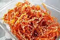 Dried shredded squid are cut into short pieces, stir-fried in oil, and coated with the sauce mixture made by mixing and boiling gochujang (chili paste), sugar, rice cooking wine, and water.[1] Sesame oil and toasted sesame seeds are sprinkled on top when served.[1]