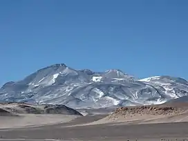 Annual precipitation consists mostly of hail and snow.[17] It either amounts to less than 150 millimetres (5.9 in) per year[113] or reaches 300–500 millimetres (12–20 in) per year. Compared to sites farther north falls primarily during winter[53] although snowfall is common in summer.[113] Precipitation probably peaks at 5,500 metres (18,000 ft) where the cloud base lies;[108] above that elevation it decreases to about 200 millimetres (7.9 in).[114] Snow cover in the area is sporadic[115] and quickly sublimates,[38] which hinders its measurement;[113] the average snow cover is less than 5 centimetres (2.0 in) thick.[116] The dry climate prevents the development of substantial glaciers in the region; only farther south at Tronquitos does more extensive glaciation begin[53] although temporary ice and snow accumulations can be mistaken for glaciers.[117]