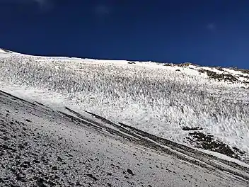 Penitentes have been encountered by climbers as early as 1937,[49] in 1949 there were reportedly 5–8 metres (16–26 ft) high penitentes on Ojos del Salado.[73] Penitentes are high ice spires[74] which form when ice sublimates in the intense insolation.[69]