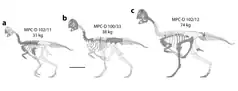 The holotype is a nearly complete juvenile skeleton intertwined with three other individuals. Notably, three skulls and a good amount of arm material are known. The known manus has only two functional fingers, with the third being significantly reduced. Such a morphology is also seen in a wide variety of theropods such as a few carcharodontosaurian allosauroids,[2] however it can also be seen in other coelurosaurs such as the tyrannosaurids, the avialan Balaur bondoc, and caudipterid oviraptorosaurs.[1]