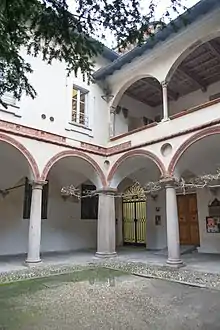 The two courtyards were modified between 1661 and 1671, based on a project by Giovanni Ambrogio Pessina, who also worked on the Fabbrica del Duomo of Milan.[4]
