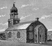 In 1712 the church requested a royal charter; seven years later it was granted by King George I in exchange for a peppercorn in rent every year.[9] Two years later, in 1721, it was expanded, early in the half-century tenure of Dominie Petrus Vas. A doop huys, a sort of chapel, was built to handle baptisms, meetings and other consistorial activities. Vas would, three decades later, oversee the construction of a second church building. Surviving prints show a gambrel-roofed meetinghouse two bays wide with a tower on the front. Its siding seems to have been limestone rubble, although the first print shows a material that could be either in a coursed ashlar pattern or parging to mimic coursed stone. Fenestration consisted of three round-arched windows along the sides. It was dedicated on November 29, 1752, by Georg Wilhelm Mancius, Vas's assistant.[2]