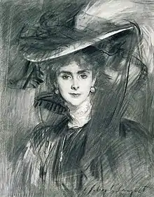 Known for "her elusive combination of childlike innocence and soigné charm" and described as "tall and slender, with Venetian red hair", Olga de Meyer was muse and model to many artists, among them Jacques-Émile Blanche, James McNeill Whistler, James Jebusa Shannon, Giovanni Boldini, Walter Sickert, John Singer Sargent, and Paul César Helleu.[20][21][22] Another of her artist admirers was Charles Conder, who was infatuated by Olga Caracciolo and painted her portrait; Aubrey Beardsley was part of her youthful circle as well.[21] Olga de Meyer also inspired characters in novels by Elinor Glyn and Ada Leverson.