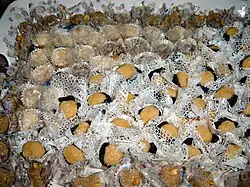 Olho de sogra (‘mother-in-law's eye‘ in Portuguese) is a Brazilian candy, consisting of a beijinho candy inside a dried plum (though some recipes include egg yolk). The final mix is rolled over crystal sugar. The name comes from the shape of the candy, which resembles an eye.