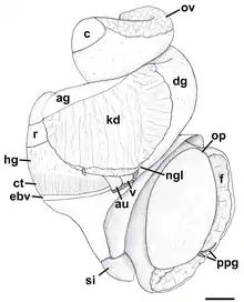 ![]() Apertural view of anatomy of Oligohalinophila dorri. ag, albumen gland; au, auricle; c, caecum; ct, ctenidium; dg, digestive gland; ebv, efferent branchial vein; f, foot; hg, hypobranchial gland; kd, kidney; ngl, nephridial gland; op, operculum; ov, ovary; ppg, propodial pedal gland; r, rectum; si, siphon; v, ventricle. |