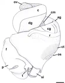 Females: ovipositor is forming deep, simple pore surrounded by weakly developed subepithelial glands.[4]