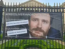 Banner of #freeoliviviervandecasteele in Brussels (26 May 2023)