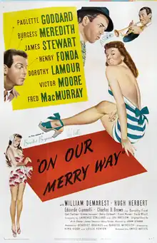 On Our Merry Way is a 1948 American comedy film produced by Benedict Bogeaus and Burgess Meredith and released by United Artists. At the time of its release, King Vidor and Leslie Fenton were credited with its direction, although the DVD lists John Huston and George Stevens, who assisted with one of the segments, as well. The screenplay by Laurence Stallings and Lou Breslow, based on an original story by Arch Oboler, is similar in style to that of Tales of Manhattan (1942), another anthology film made up of several vignettes linked by a single theme. The picture stars Paulette Goddard, Burgess Meredith, James Stewart, Henry Fonda, Harry James, Dorothy Lamour, Victor Moore and Fred MacMurray. It marks the first joint movie appearance of Stewart and Fonda, who play a pair of musicians in their section of the film.