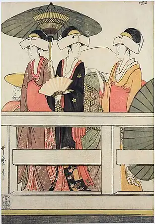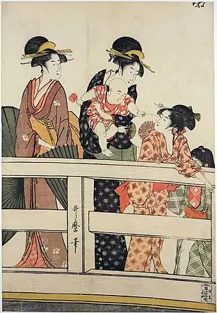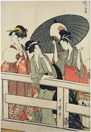 Nine elegantly-dressed[12] tall women[6] stand or lean on the bridge, watching the river flow beneath. Some hold hand fans or parasols,[12] suggesting a hot summer scene. The women come from different social rankings. From details such as the hairstyles some of the women are recognizable as geishas. The women in the upper left are women-in-waiting from a feudal lord's palace, and are wearing age-bōshi[lower-alpha 2] head-dresses, which were popular during Japan's Edo period. A woman holding a child stands at the centre,[8] and to the right is a group of entertainers.[9] Behind the woman furthest to the right holding a round hand fan can be seen a water-seller's equipment; fresh water was scarce in the area, as it was made from reclaimed land by the ocean. Such merchants sold slightly sweetened water from distant springs.[6]