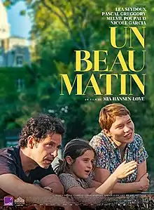 One Fine Morning (French: Un beau matin) is a 2022 romantic drama film written and directed by Mia Hansen-Løve. It stars Léa Seydoux, Pascal Greggory, Melvil Poupaud and Nicole Garcia. The film premiered in the Directors' Fortnight section of the 75th Cannes Film Festival on 20 May 2022, where it won the Europa Cinemas Label Award for Best European Film.[3] It was released theatrically in France on 5 October 2022 and in Germany on 8 December 2022.