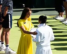 Ons Jabeur receives the 2022 Wimbledon Championships Finalist Shield from Kate Middleton, then the Duchess of Cambridge.