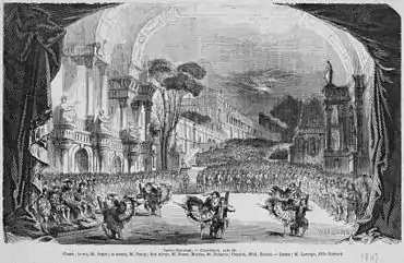 In 1851, the Opéra-National was revived, and on 1 May Edmond Seveste was appointed director.[16] By the end of July he had taken a lease on the Théâtre Historique (72 Boulevard du Temple).[17] Built by the dramatist Alexandre Dumas, the theatre had opened on 20 February 1847, closed on 20 December 1850, and remained unused. The entrance to the theatre was a long, narrow vestibule, squeezed between two other buildings, with a facade only eight meters wide. The auditorium, located in the back, was unusually wide (20 meters) and only 16 meters deep.[18] It had an audience capacity of 1500–1700[2] and was thought to have excellent acoustics for opera.[17]