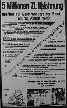 Following the German invasion and occupation of Poland in 1939, a large resistance network was formed. That resistance required funds to operate, and the resources of the Polish government in exile, delivered through the cichociemni commando-couriers, were limited.[2] In 1942 the resistance began planning to acquire money from the occupiers by carrying out large-scale robberies.[1] Having learned that a large quantity of money would be moved by the occupiers to the German-established Bank of Issue in Poland, the resistance recruited a number of sympathizers within the bank.[1] Preparations lasted about 14 months.[2]