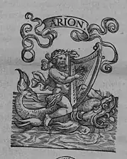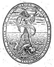 Looking at title page or at the colophon of an Oporinus edition, the printer's device shows the mythological lyre player Arion of Lesbos, which is supported by a Dolphin on the sea. There are more variant forms of it, some are shown below.