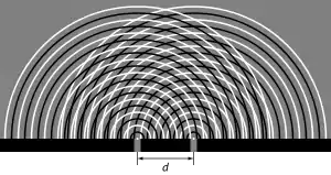 where is the separation between two wavefront sources (in the case of Young's experiments, it was two slits), is the angular separation between the central fringe and the th order fringe, where the central maximum is .[57]