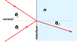 where and are the angles between the normal (to the interface) and the incident and refracted waves, respectively.[41]