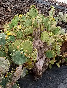 It is a tree species, 1.5–5 m high, open branching, sometimes with a canopy almost 2 m in diameter. Defined trunk, 200 x 20 cm, grayish to blackish, spiny, bark with scales in wavy longitudinal bands. Widely obovate cladodios, 22-35 x 15-25 x 1–3 cm, bright, greenish yellow to dark green blue, coated with white wax, pruinous. Epidermis glabra, opaque. Areolas arranged in 10-16 series, 2–3 cm distant from each other, circular pyriforms at the base of the cladode and obovate to piriforms at the top, inclusive, 4–6 mm x 2 mm, brown felt in the center and blackish around the areola. Goloquids0.1–1 cm long, greenish yellow. Thorns 3–8 cm, increasing with age, subulated, slightly angulated, divergent, not adpressed, flattened but not twisted 0.2–2 cm long, white with yellow translucent apex . Flowers 9.5 cm long and 9 cm in diameter in the anthesis, yellow; yellow filaments and anthers, pink style, 6 stigma lobes; external segments spatulated with the mucronized apex, light yellow, with a broad, reddish medium band; interior segments spatulated with the mucronized apex, yellow; pericarpel of 4-4.5 cm long. Fruits obovate to subglobosos, from light red to intense; with pericarpelthick, 1–3 cm wide, acidic, subcircular to obovate areoles, with yellow felt, yellow gland, and spines of ca. 1.2 cm long, deciduous, yellow; red pulp Floral scar 2.2 cm in diameter, almost flat, 0.7 cm deep, xoconostle . Reniform seeds, angled with narrow white aryl and lateral thread rate.[3]