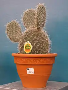 The cladodes are blue-green or, when getting older, green-yellow, 10 to 14 centimeters long and up to 9 centimeters wide. The areoles with dark color support grey-yellow glochids, with long white hairs of trichome.[1]