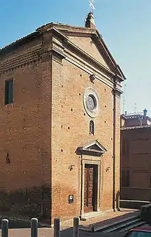 The oratory was initially built by the Confraternity of San Rocco in 1511.[1] The simple two story building has been the property of the Contrada della Lupa, a ward in north Siena, since 1789. The brick façade has an oculus with a 16th-century statue of St Roch, and a travertine marble tympanum.