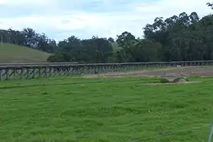 Orbost straddles the Princes Highway. A 567 metre bridge over the Orbost floodplain opened in November 1976.[8] The town was connected to Melbourne when the Gippsland railway line opened to Orbost station in 1916 principally carrying timber and farming produce. In the early days of the railway's operation dedicated passenger trains ran but these ceased by the 1930s. The line closed in 1987 when the line was cut back to Bairnsdale. The track infrastructure was dismantled in 1993/94.[9] The line traversed a mixture of farmland, hills and heavily forested country. It included numerous bridges, including the Stoney Creek Trestle Bridge, the largest of its kind in Victoria.[10] Public transport services are provided to the town by V/Line with road coach services from Batemans Bay, Marlo and Canberra to Bairnsdale that connect with train services to Melbourne.[11][12][13]
