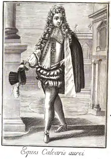 It is accounted the earliest papal chivalric institution.[3] The Order of the Golden Spur had its origins in the title Count palatine of the Lateran Palace,[4] which was in the gift of the Holy Roman Emperor in the fourteenth century: Charles IV, Holy Roman Emperor conferred the title on one Fenzio di Albertino di Prato, 15 August 1357, at Prague.[5] The Order began to be associated with the inheritable patent of nobility in the form of count palatinate during the Renaissance; Emperor Frederick III named Baldo Bartolini, professor of civil law at the University of Perugia, a count palatinate in 1469, entitled in turn to confer university degrees. "Bartolini also received the Knighthood of the Golden Spur, a title that sometimes accompanied the office of count palatinate in the Renaissance", according to the historian of universities Paul F. Grendler;[6] the Order of the Golden Spur, linked with the title of count palatinate, was widely conferred after the Sack of Rome, 1527, by Charles V, Holy Roman Emperor; the text of surviving diplomas conferred hereditary nobility to the recipients. Among the recipients was Titian (1533), who had painted an equestrian portrait of Charles.[7] Close on the heels of the Emperor's death in 1558, its refounding in Papal hands is attributed to Pope Pius IV in 1559.[8]