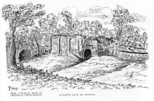 Before the River Irwell was deepened to make it navigable there was an ancient paved ford at Ordsall known as Woden's Ford and nearby, in a lane leading to Ordsall Hall, was a cave known as Woden's Den. The cave was of great interest to 19th-century antiquarians, but their constant trespassing to view the site prompted the landowner to completely destroy it early in the century, and no trace of the feature remains. However, the cave was described and sketched by Thomas Barret in about 1780.[note 1] Hibbert was convinced that the cave was a temple to Odin, saying in his book History of the foundations in Manchester of Christ's College, Chetham's Hospital and the Free Grammar School (1830), "There can be little question but that in this recess the sacrifices, divination and compacts appertaining to worship of the hero of the Edda were regularly practised".</ref>[4] He postulated that, as this part of the Irwell was subject to regular flooding, travellers would have made offerings to Odin, the protector of travellers, before attempting the crossing.[3] He also said that there were strong grounds to suppose that Cluniac monks of Lenton Priory, who had a cell called "St Leonards" at nearby Kersal, converted the cave into a Christian hermitage and served as guides to the crossing at Woden's Ford and the surrounding marshes in order to supplant the earlier pagan practices.[3][5]