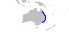 The ornate wobbegong lives in tropical and warm temperate waters no deeper than 100 metres (330 ft).[9] It is native to eastern Australia, in the western Pacific Ocean. Reports have been confirmed at Port Stephens and Sydney. Although it has also been reported to live in Indonesia, Japan, and Papua New Guinea, the International Union for Conservation of Nature (IUCN) states that these reports probably misidentified other fish for this species, which would make the ornate wobbegong endemic to Australia.[1] However, according to the Florida Museum of Natural History, it does live in Indonesia and Papua New Guinea. This report has to be verified.[5]
