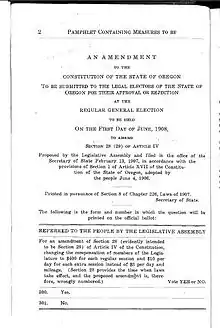 Oregon Ballot Measure 1 (1908) Ballot measure 1 was a proposed constitutional amendment through the referendum process of Oregon, USA. The amendment would have amended Section 28, Article IV, of the Constitution of the State of Oregon.[1] This measure, if passed, would have increased compensation for legislators from $120 to $400 per session.[2] The measure was struck down by a popular vote of 68,892 to 19,691 on June 1, 1908.[2]