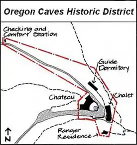 The United States Forest Service was given responsibility for the Oregon Caves National Monument in 1909. Due to the caves remote location the first permanent road to the site was not completed until 1922. In 1934, oversight of the monument passed to the National Park Service. Over the next nine years, the Park Service worked with the Civilian Conservation Corps to develop and landscape the Oregon Caves site to attain the look of a "rustic alpine village" nestled in a mountain canyon. The Park Service's naturalistic design principles dictated the use of indigenous materials and rustic stone work. Every element was careful set in place to highlight the rugged character of the canyon. Cedar-bark sheathing was used as a unifying design element on all the buildings.[7] While some changes have been made to the original structures, the buildings still retain their unique rustic character which is enhanced by the surrounding park landscape. In 1992, part of the Oregon Caves National Monument was designated a historic district and listed on the National Register of Historic Places.[8]