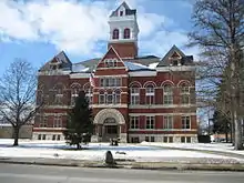 The Romanesque Revival Ogle County Courthouse stands in the middle of a large public square. Though no longer the county's primary judiciary center some county office still occupy the first two floors. The building was designed by Chicago architect George O. Garnsey and constructed in 1891.[1]