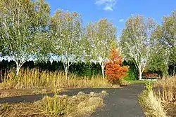 The Oregon Association of Nurseries first conceived the idea of a public showcase garden in the 1940s. Work towards the creation of such a garden began in earnest around 1990, when the OAN began seeking a location for their project. Around that same time, the City of Silverton was searching for a way to use their reclaimed wastewater.[3] These serendipitous situations led Silverton to purchase the land south of downtown and dedicate it to the future garden in 1995.[4] As a result, Silverton's wastewater is filtered through a series of terraced wetlands located in the garden, collected in a holding tank and used to meet all of the garden's irrigation needs. In April 1996, a master plan was created for the garden which includes ultimately developing all 240 acres (0.97 km2) of the site.[1][5] The groundbreaking ceremony occurred June 27, 1997, and featured high-ranking Oregon politicians.[lower-alpha 1] The garden opened to the public during a dedication on April 17, 1999. Attendance at the garden totaled 250,000 visitors the first year.[1] Subsequent ceremonies dedicated additional features such as the Gordon House on March 2, 2002, and the Rediscovery Forest and Natural Resources Center on June 7, 2002.[6]