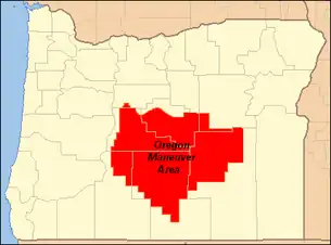 The maneuver extended across parts of seven eastern Oregon counties, a total of over 10,000 square miles (26,000 km2). Almost all of Deschutes County was included in the maneuver area along with large parts of Crook, Harney, Klamath, and Lake counties. Small portions of Jefferson and Grant counties were also included in the maneuver area. The area included parts of four national forests, the Deschutes National Forest in the west, the Fremont National Forest in the southwest, the Ochoco National Forest in the north and the Malheur National Forest in the northeast plus vast tracts of land administered by the Bureau of Land Management throughout the maneuver area. The maneuver area was an irregular triangle shape, with Sisters in the northwest corner, Burns in the northeast corner, and Valley Falls in the south.[1][4][5]