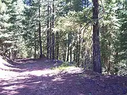 To the east, the line extended as far as Idanha, 15 miles (24 km) short of Santiam Pass before running out of money.[2][3] Hogg purchased the steamship Yaquina City to provide a direct link to his railroad between Yaquina and San Francisco. Yaquina City successfully completed several voyages, until she ran aground at Yaquina Bay in 1887 due to a rudder failure. Despite the Yaquina City being insured, Hogg had just lost his biggest source of income and could not immediately replace the steamer. Hogg's contract with the government stated however, that if he could establish railroad service over the Cascade Mountains, he could receive a massive land grant. By selling this land, enough money could be made to keep the railroad in business.[5] To get the grant, some additional track was laid over Santiam Pass. Hogg had mules pull some cars a few times to assert right of way.[2] Hogg Rock near Santiam Pass is named for T. Egenton Hogg for his railroad which went around the rock. Track was also laid in the canyon of the Malheur River to reserve that pass for the railroad.