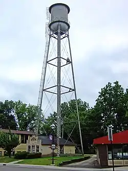 The water tower and pump house were built in 1899 after concerns were raised in Oregon about fire protection and water supply. In 1921, the wooden tank on the tower was replaced with a metal one.[2] The water tower was drained and removed from service in 1981. The pump house and water tower were designated cultural landmarks by the village board after that. In 2007, both were listed on the state and national registers of historic places. The chairman of the Oregon Historic Preservation Commission, described the tower structure as iconic and representative of downtown Oregon and small-town America in general.[3] The New York Times reported in 2009 that other small towns in the United States were also seeking to preserve ordinary, utilitarian structures, describing them as "the things that represent ordinary people and workers."[4]