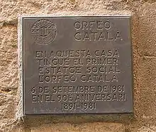 Plaque on the building in Carrer de Lledó in Barcelona, where Orfeó Català was first based
