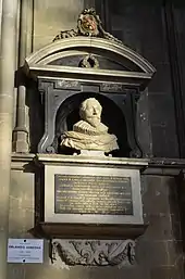 During late May 1625, the English court was preparing to receive Queen Henrietta Maria, whom the now King Charles I of England had married through proxy in France on 1 May.[71] Gibbons and other Chapel Royal members had begun travelling to Canterbury on 31 May when Gibbons suddenly succumbed to an illness, probably a brain haemorrhage.[52][72] He died at age 41 in Canterbury and was buried in Canterbury Cathedral.[72] His death was a shock to his peers and brought about a post-mortem, although the cause of death aroused less comment than the haste of his burial and his body's not being returned to London.[32][73] His wife Elizabeth died a little over a year later, in her mid-30s, leaving Orlando's eldest brother, Edward to care for the orphaned children.[74]