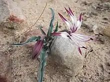 The plant can grow from 5 to 20 centimeters in height. There are two to four leaves that are lanceolate in shape which are undulated, the leaves are 10 centimeters in length and are a blue-grey color.[4] The flowers are zygomorphic and nodding downwards on pedicels, they range in color from white to pink, with maroon tips, and are fragrant during the night.[4][2] The plant flowers between the months of April and July.[2] They are most often found on rocky terrain, usually in granite or sandstone slopes.[4] The plants are perennials and have an underground corm.[3]
