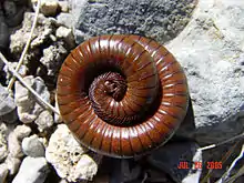 Orthoporus ornatus (also known as the desert millipede) is a North American species of millipede in the family Spirostreptidae that can be found in the U.S. states of Arizona, New Mexico and Texas, and as far south as the Mexican state of San Luis Potosí. They became very popular in the pet trade and many were exported to Western Europe. Brian Van Der Kieft and Max Prins were the first breeders of this species in Europe.[1] Individuals on average are 4 inches (10 cm) in length,[2] but can either be as small as 3 inches (76 mm),[3] or exceed up to 9 inches (230 mm) in length. They are dark brownish coloured,[4] but can sometimes be yellow. In fact, in every state the species look different.[5] The antennae are located near the organs of Tömösváry. The species feed on both living and dead organic material. The species prefer sunshine, but can be seen on summer rainy days as well. A disturbed Orthoporus ornatus may curl into a coil and release a toxic substance that is located on all sides of its body. The species can live more than ten years.[6] The species feed on shrubs of Ephedra, which grows in Jornada del Muerto, and on Salsola that grows in Albuquerque.[7]