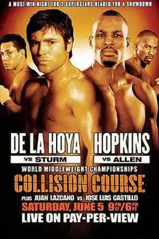 Following a controversial loss to Shane Mosley that cost him the WBA and WBC light-middleweight titles in September 2003,[1] Oscar De La Hoya announced his intentions to move up to the middleweight division to challenge undefeated WBO champion Felix Sturm, followed by a unification bout with Undisputed Middleweight Champion Bernard Hopkins should he defeat Sturm.[2] As a precursor to their planned fight, Hopkins and De La Hoya agreed to take part in a joint doubleheader pay-per-view event broadcast by HBO dubbed "Collision Course". Hopkins would first take on his mandatory challenger in Robert Allen (who had fought Hopkins twice before in the late 90s), winning easily by unanimous decision to retain his titles. The Hopkins–Allen fight was then followed by the main event between De La Hoya and Sturm, with De La Hoya needing a victory in order to preserve his match with Hopkins.