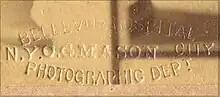 O. G. Mason's duties included photographing deceased unknowns, a service that was pioneered at Bellevue in 1867.[8] Bodies were received in a new facility constructed in 1866, modelled and named after the much larger Paris Morgue.[9] Photographing took place outside and in his report for 1875 Mason petitioned for accommodations that would protect his equipment and subject from inclement weather. Unidentified bodies were displayed up to seventy-two hours on stone tables behind a curtain wall of iron and glass dividing the 20 by 20 foot space.[9] Both photograph and body were numbered correspondingly and any unclaimed bodies were later buried at the Hart Island City Cemetery. Mason's annual reports emphasized the importance of this work and the relief it provided to the bereft who visited the morgue in search of missing loved ones.