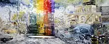 Oiwa's works often derive from observations of reality occurring around him. This can be meant in the literal sense, how he often paints the urban landscape of the cities he has lived in and has visited in his works, but he mixes his own perspectives and imagination into his depictions of the urban world, focusing on what is overlooked.[15] There is often a perspective from above, with Oiwa often choosing to depict his idea in large paintings that employ a bird's eye view, or drawing method, from his foundation in architecture and characteristic and many of his works, but also to focus on what is overlooked.[16]