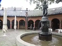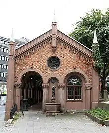 The Oslo Bazaars were constructed between 1841 and 1859 and have facades of untreated red brick. They were designed in Romanesque Revival architecture style by Christian Heinrich Grosch who acted as the city's chief architect, planning engineer, and building inspector. Originally built for butchers who sold meat at the nearby Stortorvet market place, they were later expanded after their size proved insufficient. Construction continued along the same design in a semicircle to the east of the church, with more than 50 stalls in total.[3] [4][5]