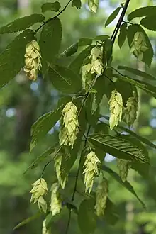 | A hophornbeam branch with the characteristic hop-resembling fruits[1] in early summer | |