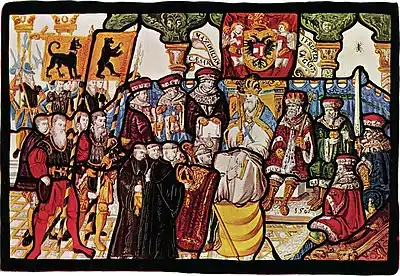 During Otmar's abbacy, the Abbey of Saint Gall renewed their alliance with France.[1] His tenure was mostly characterised by a more severe separation of the catholic abbey and the protestant city. In the Rorschach treaty of the 13 September 1566 and the ruling of Wil on 20 September 1566 it was determined that a 31ft high wall be built between abbey and city.[1] Cunstruction was largely completed by October 1567. The southern gate, the so-called Karlstor, was completed in 1570 and enabled access to the abbey without ever entering city territory.[1]